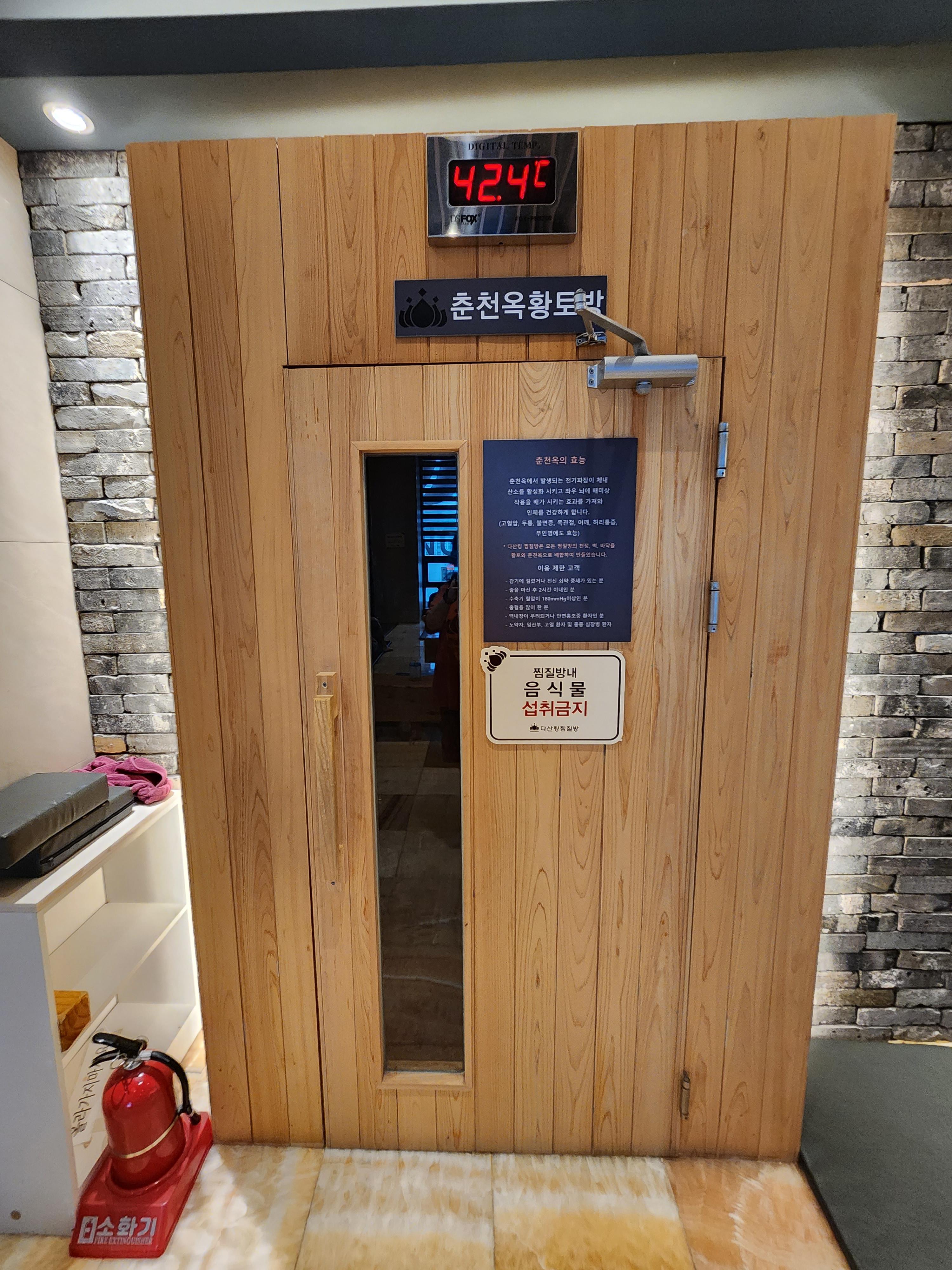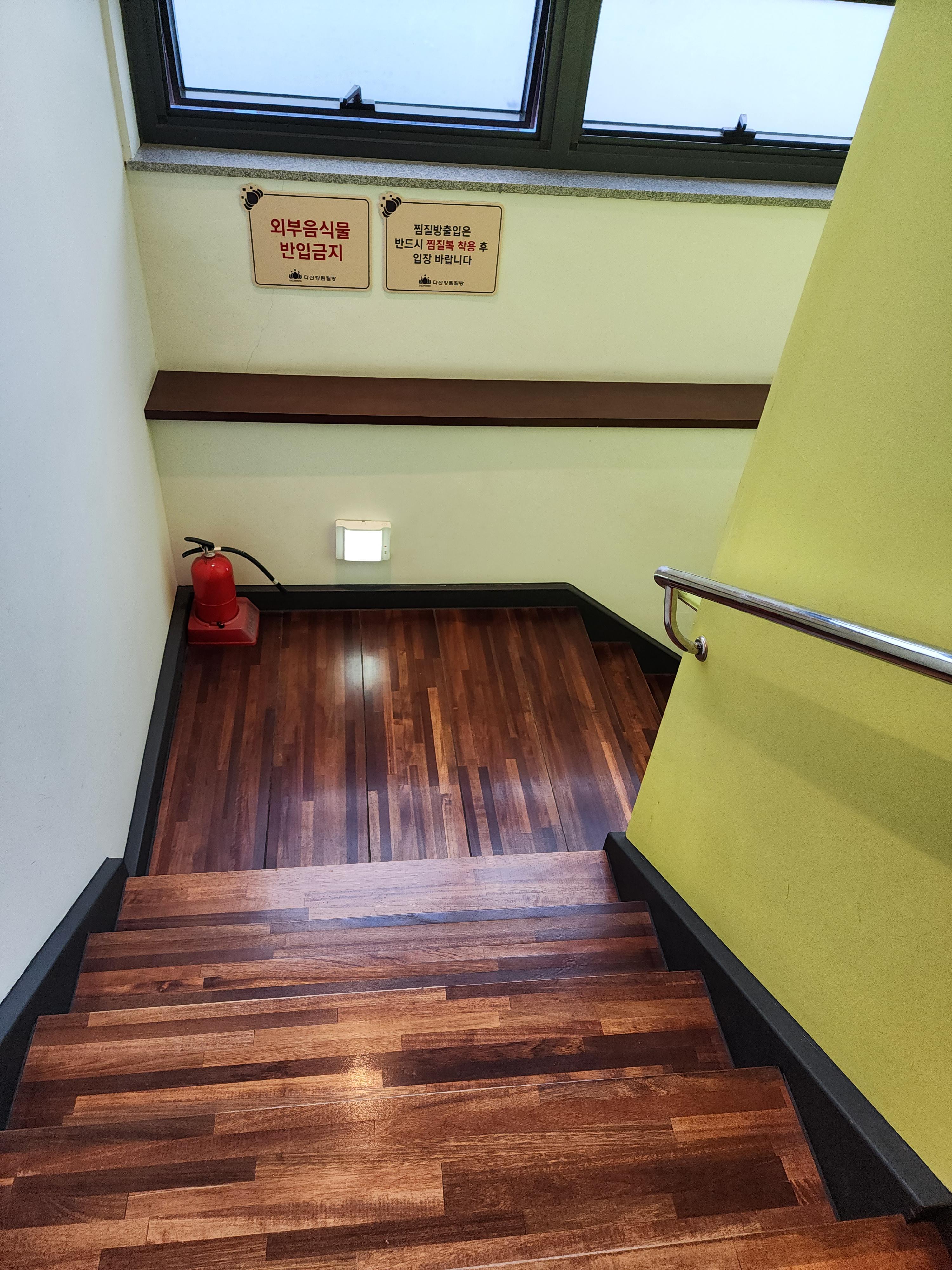 환복을 하고 찜질방으로 내려가요. 계단조심조심. 문뒤에 사람이 있을 수 있으니 조심히 열어 주세요.