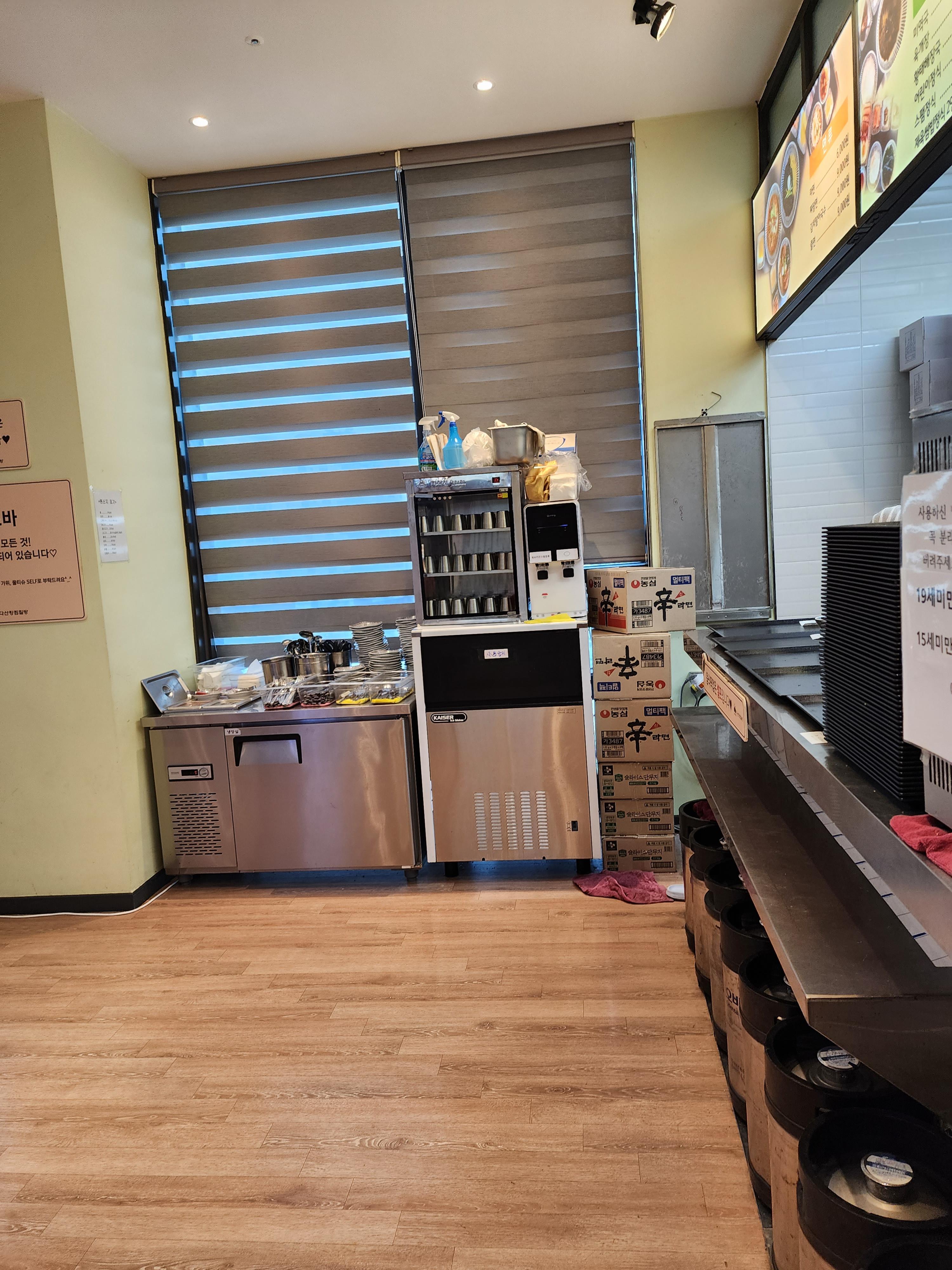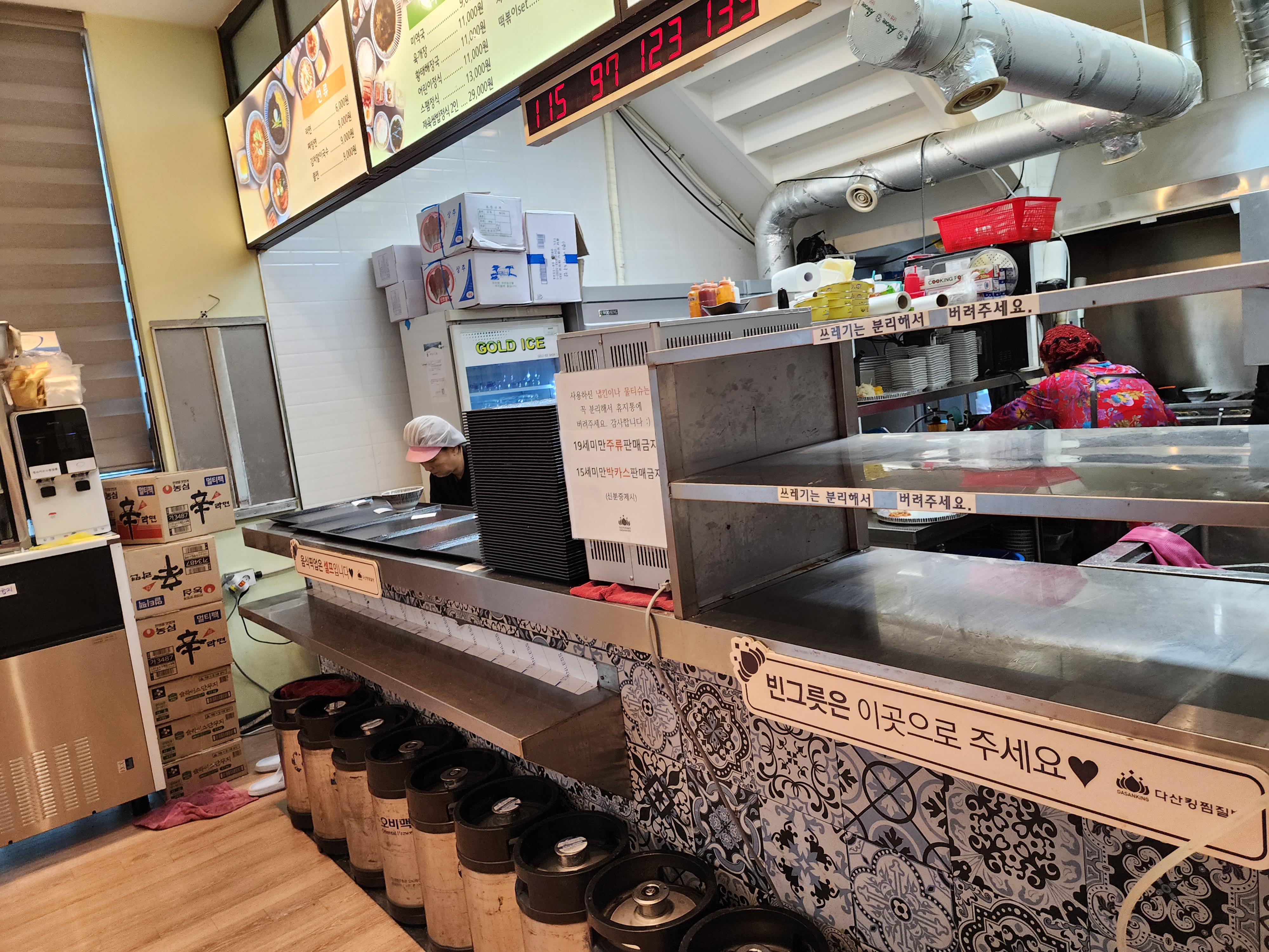 식당 한쪽에는 김치와 단무지, 앞접시와 아이들 포크, 수저등이 구비되어 있어요.