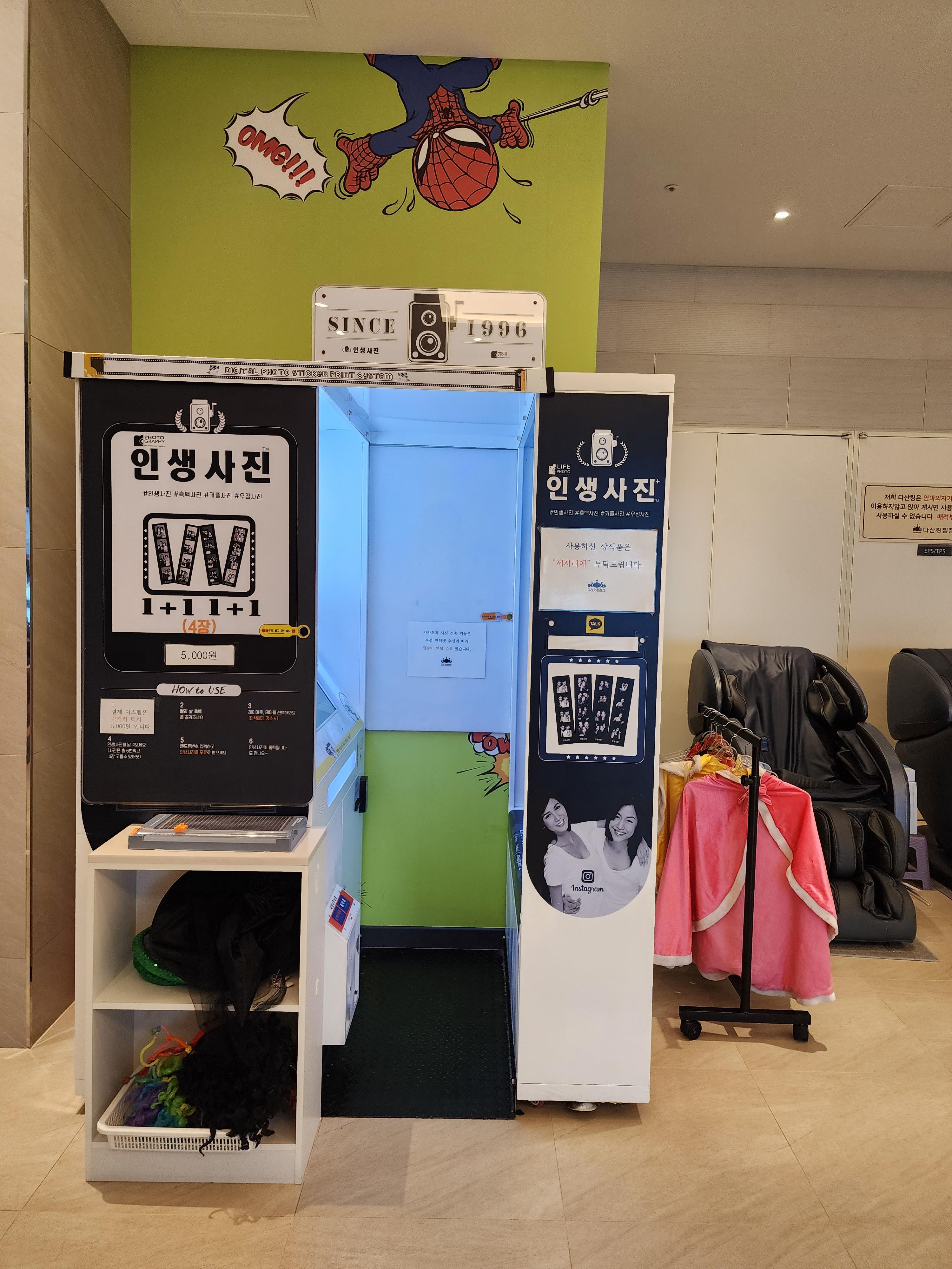 만화책이 가득 책읽는 공간도 있고 인생사진 기계도 있어요. 각종 가발과 의상 소품이 있어서 아이들이 좋아해요.
