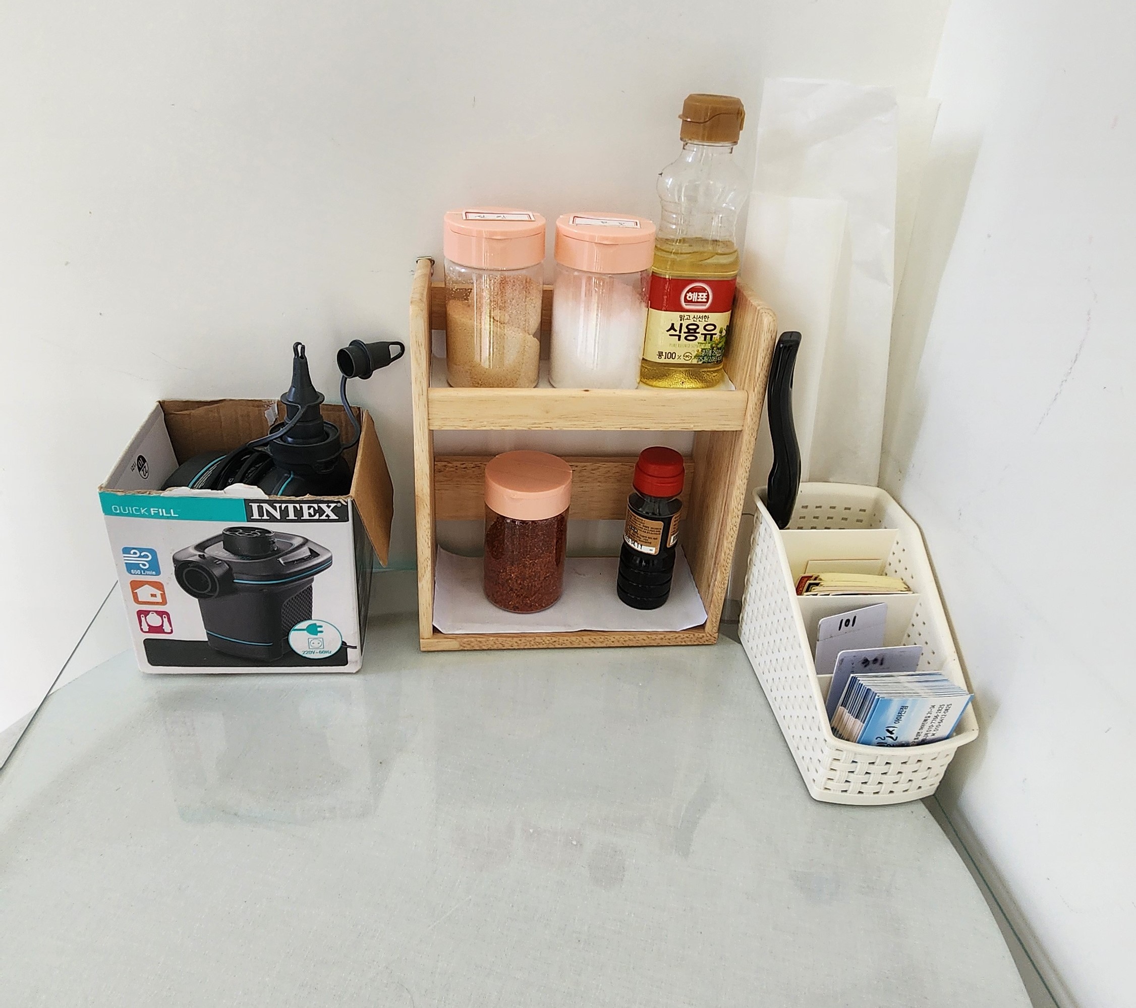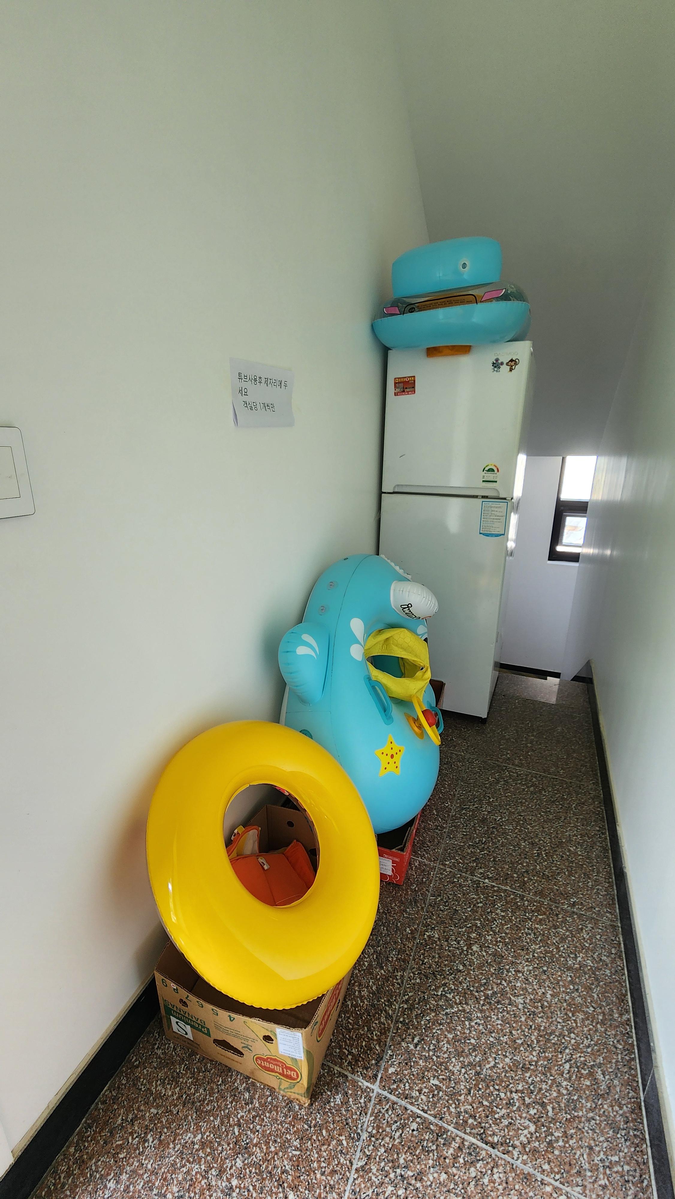 엘리베이터 옆에는 세심하게 객실 방문객을 배려하는 양념들과 튜브바람넣는수동 펌프, 튜브가 준비되어 있어요.