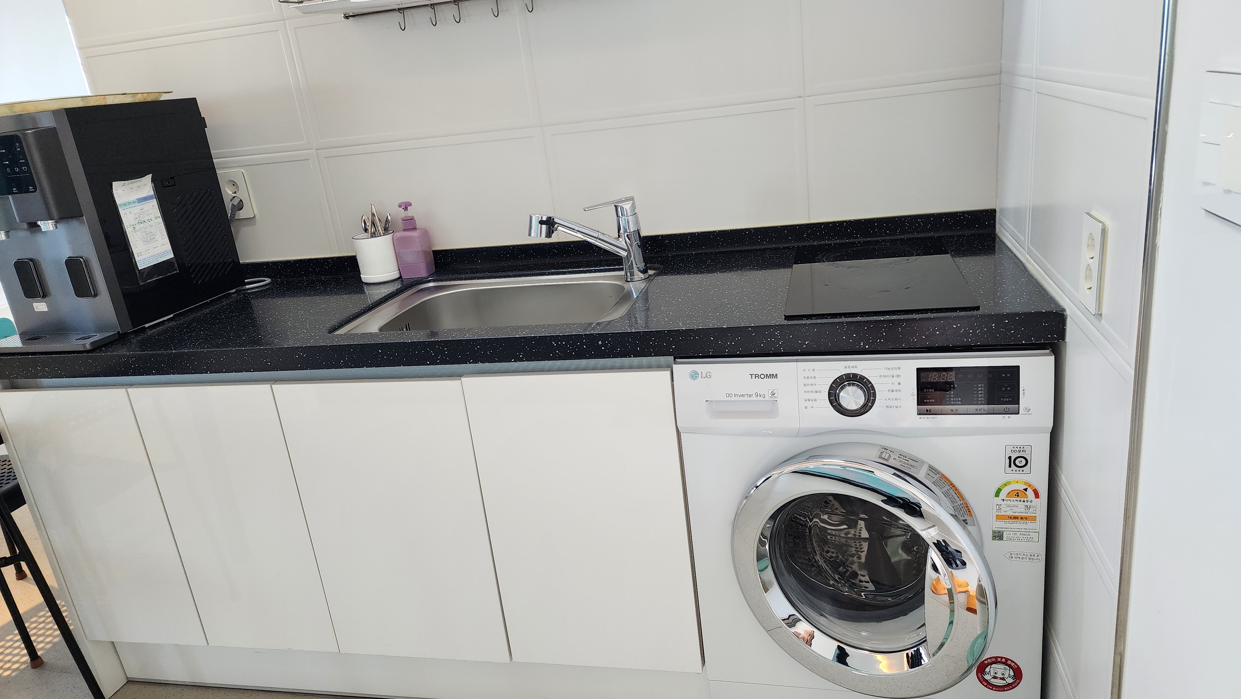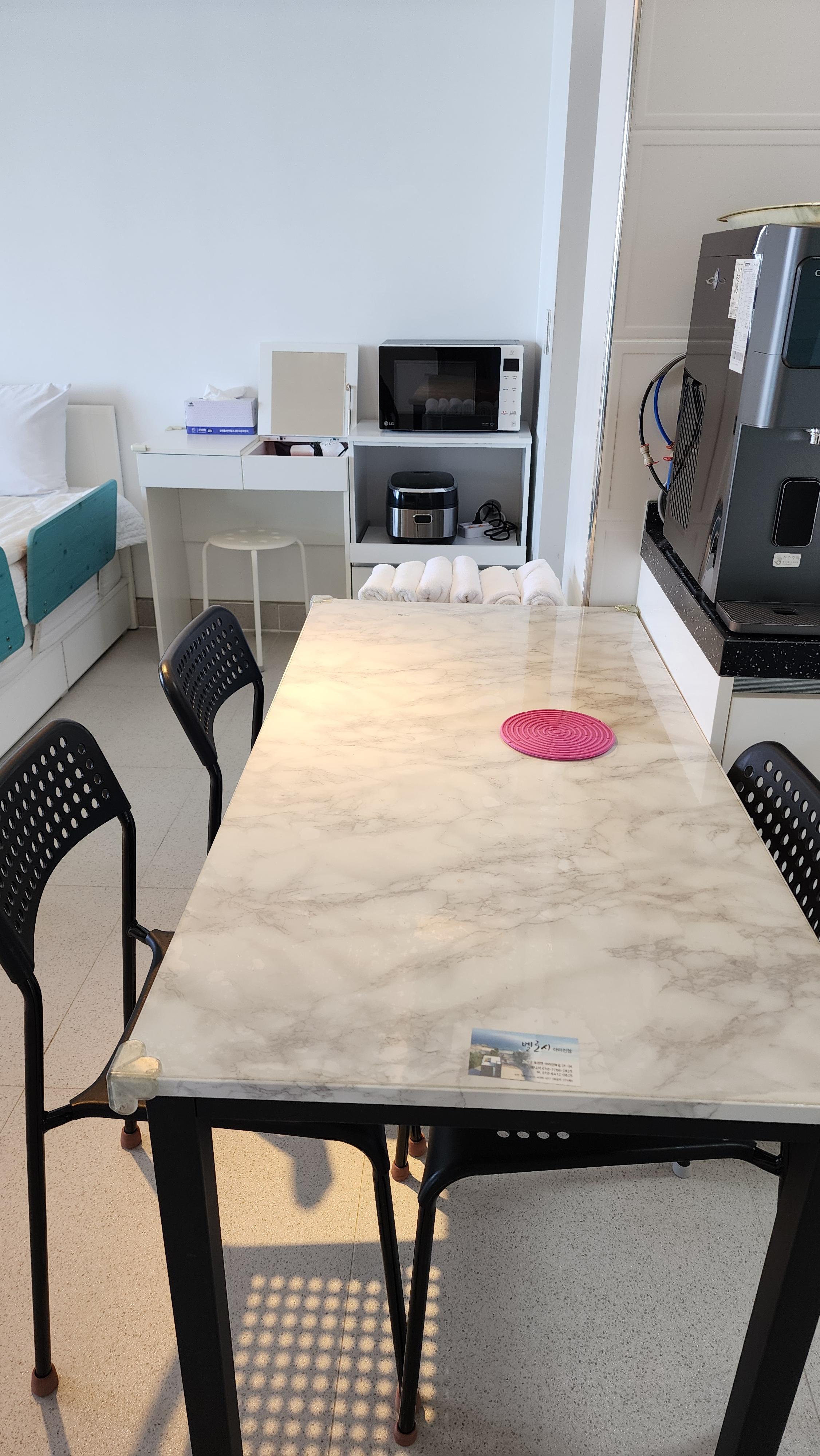 객실내부로 들어오면 정수기와 세탁기, 3인이 앉을수 있는 식탁과