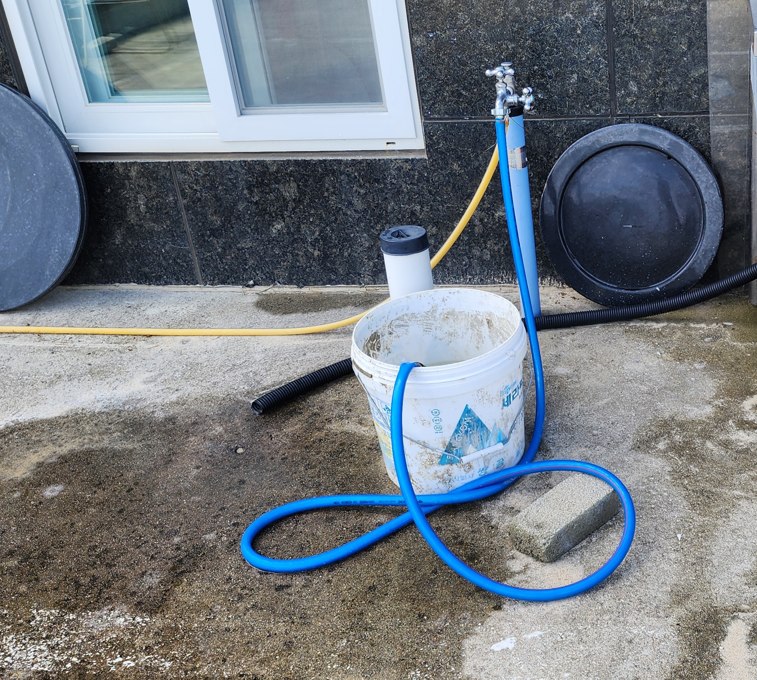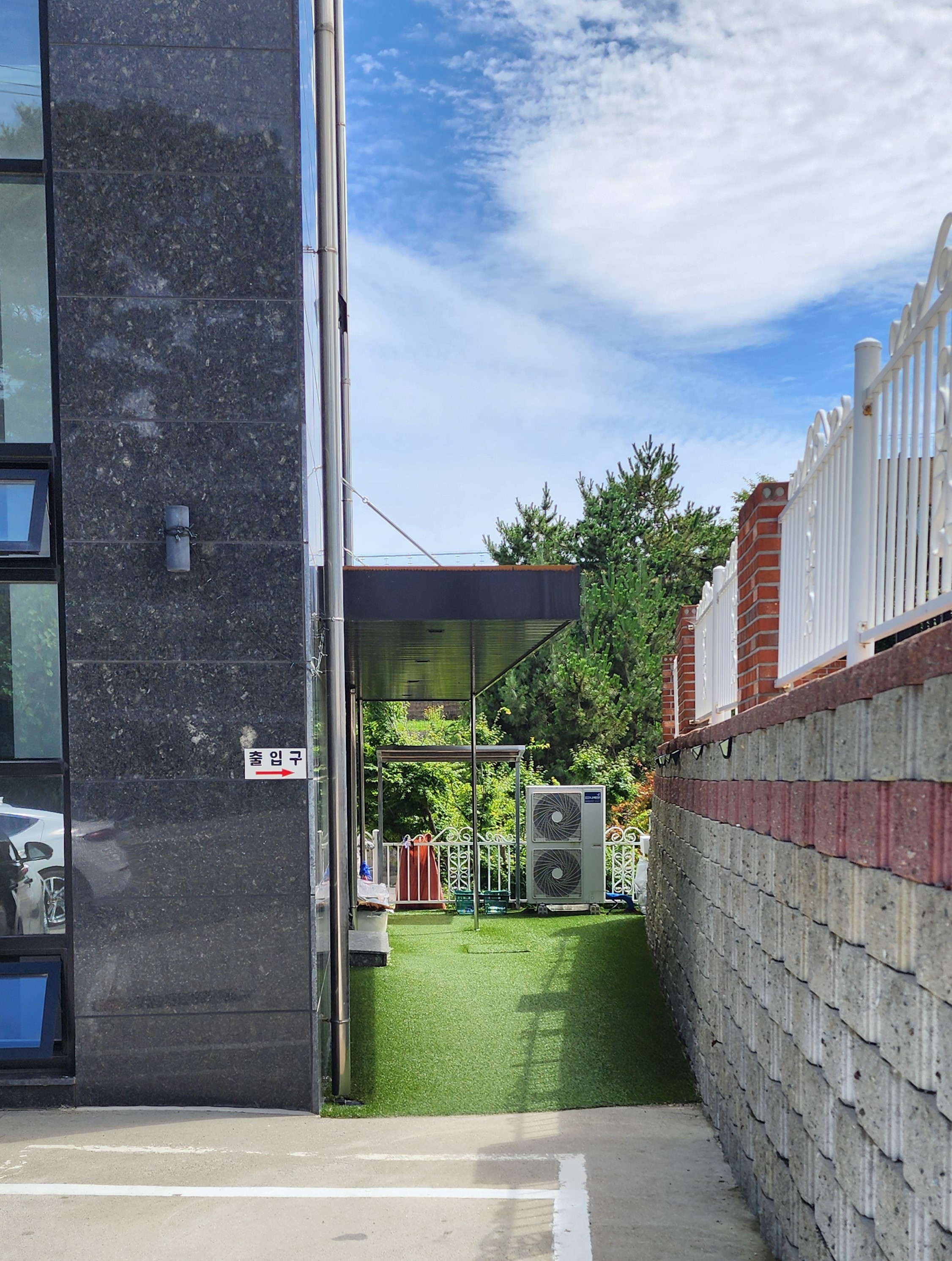 바닷가에서 놀다가 올라와서 마당에서 모래를 씻고 건물뒷편 출입구로 들어가 엘베를 타고 3층으로 올라갑니다.