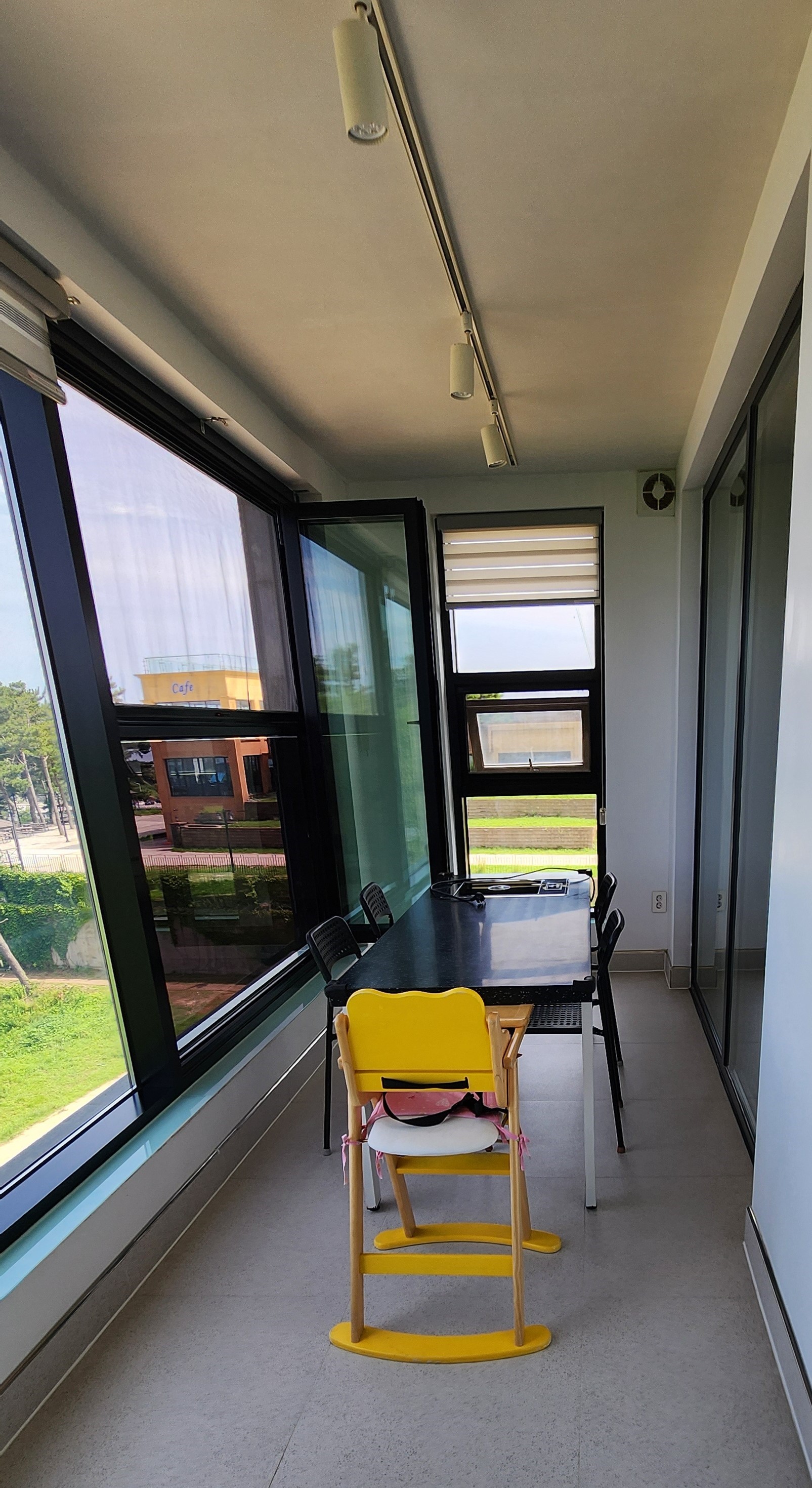 바베큐쪽 베란다는 아야진 해변 풍경이 한눈에 들어와요~ 아이들을 위한 의자와 변기도 있어요.