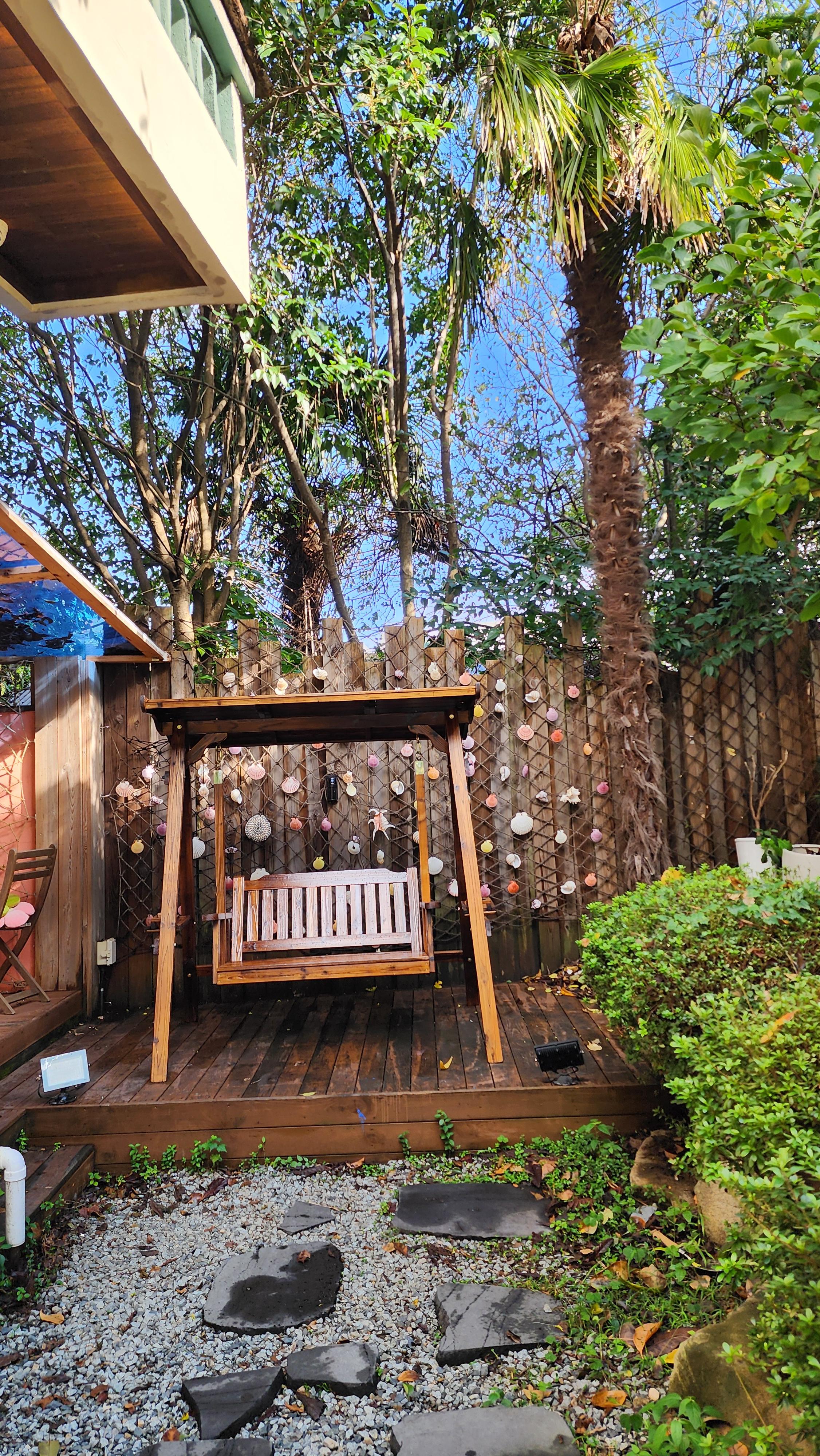 예쁜 외관과 고래거울도 아기자기하고 자그마한 정원에 돌다리를 폴짝폴짝 디디며 가면 그네 의자가 있어요.