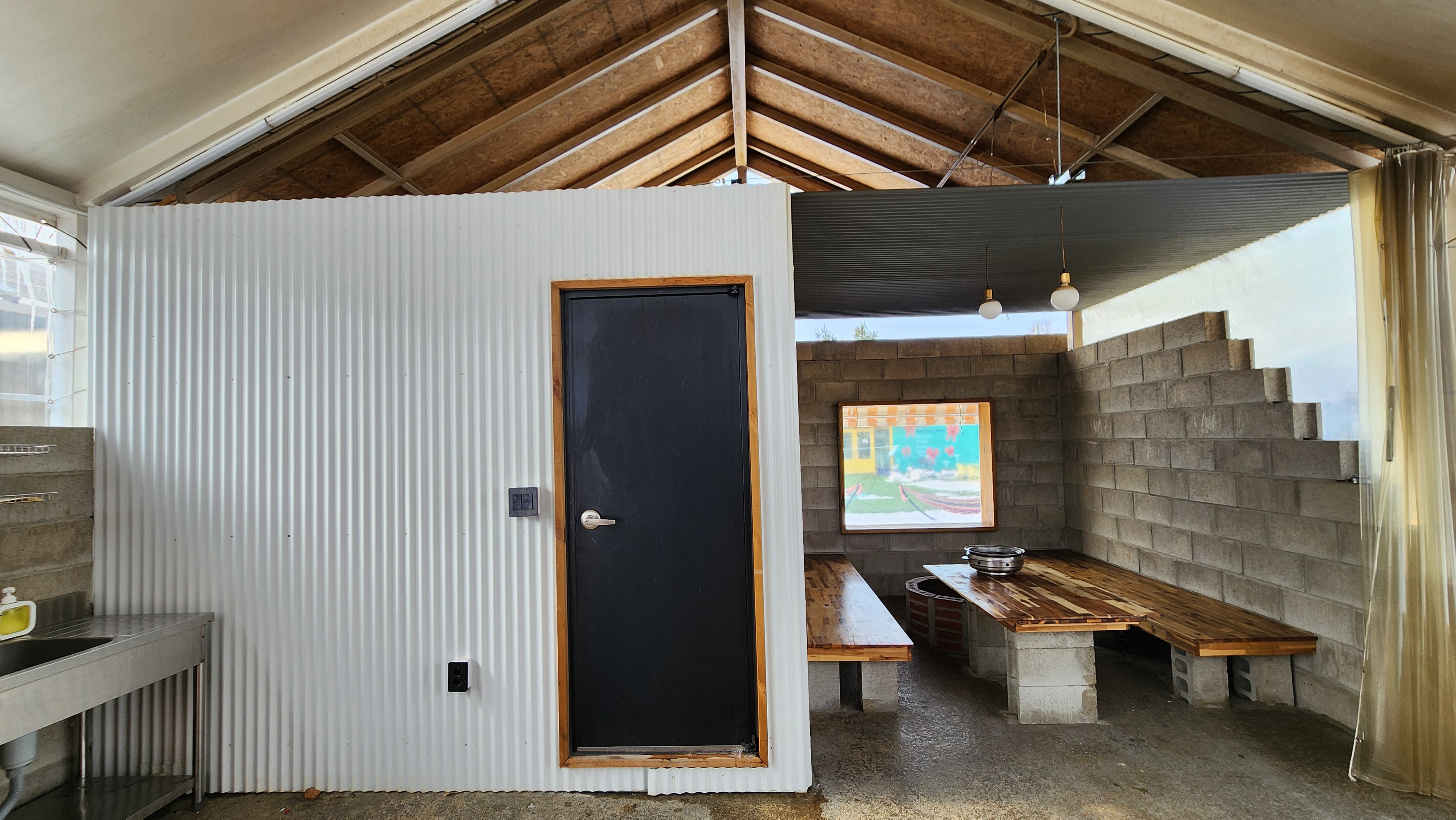 안으로 들어가면 불멍공간과 고기 구워먹는 곳이 있고 화장실이 있어요. 개별 개수대와 전자렌지, 냉장고가 있어요.