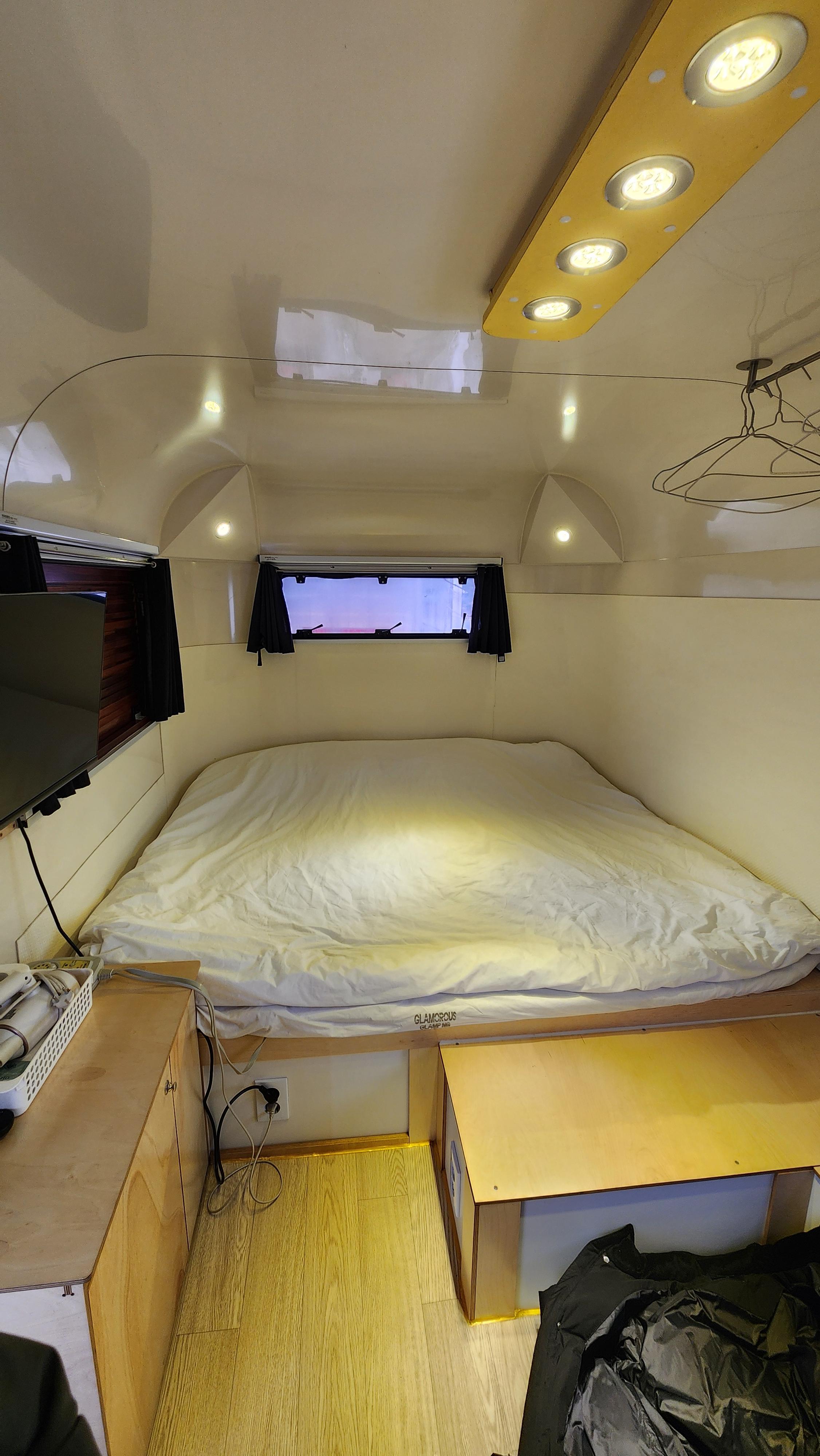카라반 문을 열고 들어가면 넓은 침대가 있고 다른 쪽에는 이층 침대가 있어요.