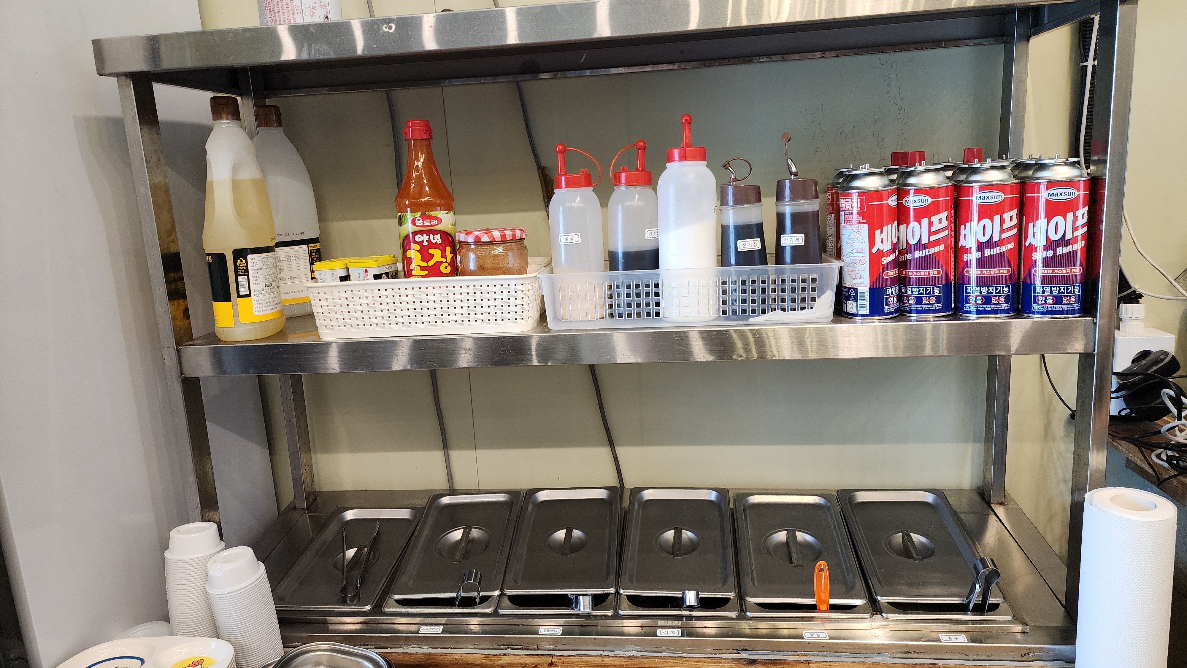 초장, 식용류, 여러가지 양념과 반찬도 준비되어 있어요.