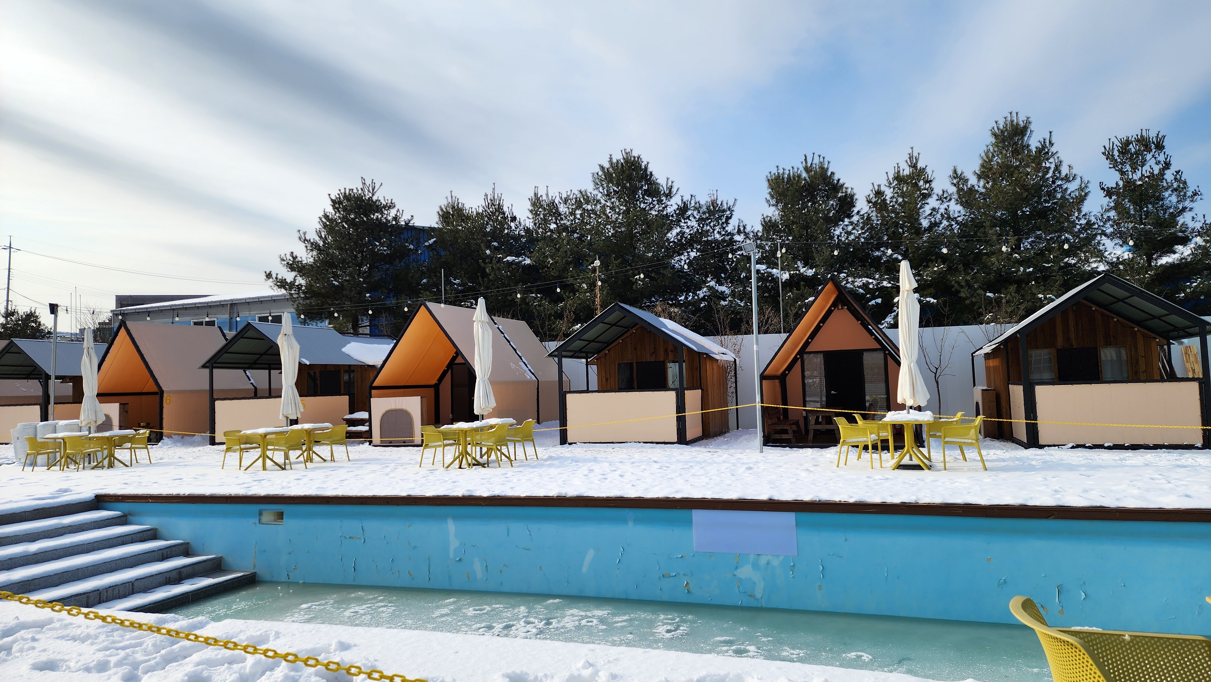 카라반 글램핑장 맞은 편에는 당일 온수풀장 고객님들의 천막이 자리하고 있었어요.