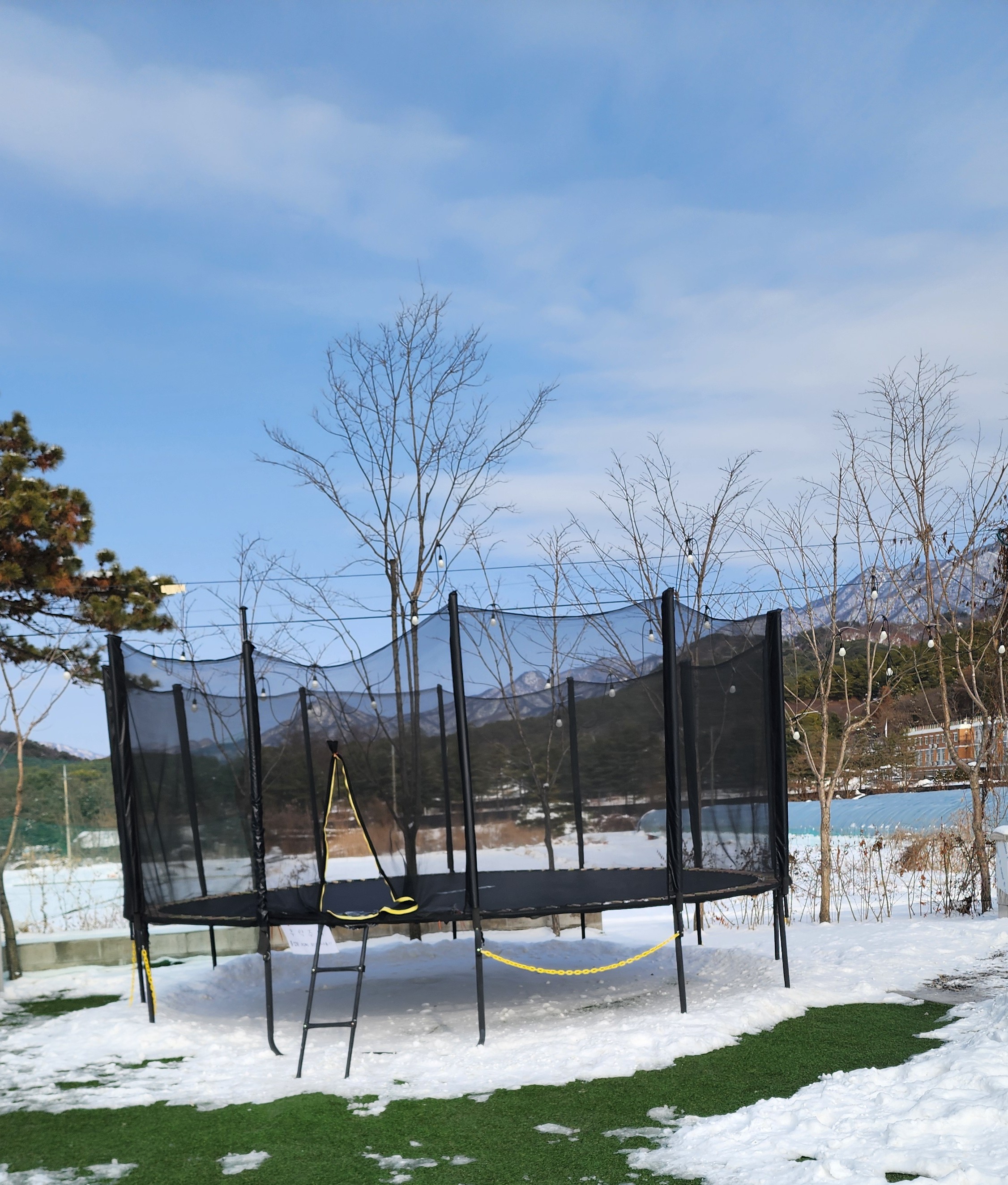외부에도 놀거리가 많았는데요~ 눈썰매와 농구, 탁구, 배드민턴과, 빠질 수 없는 트램폴린이 있어요.