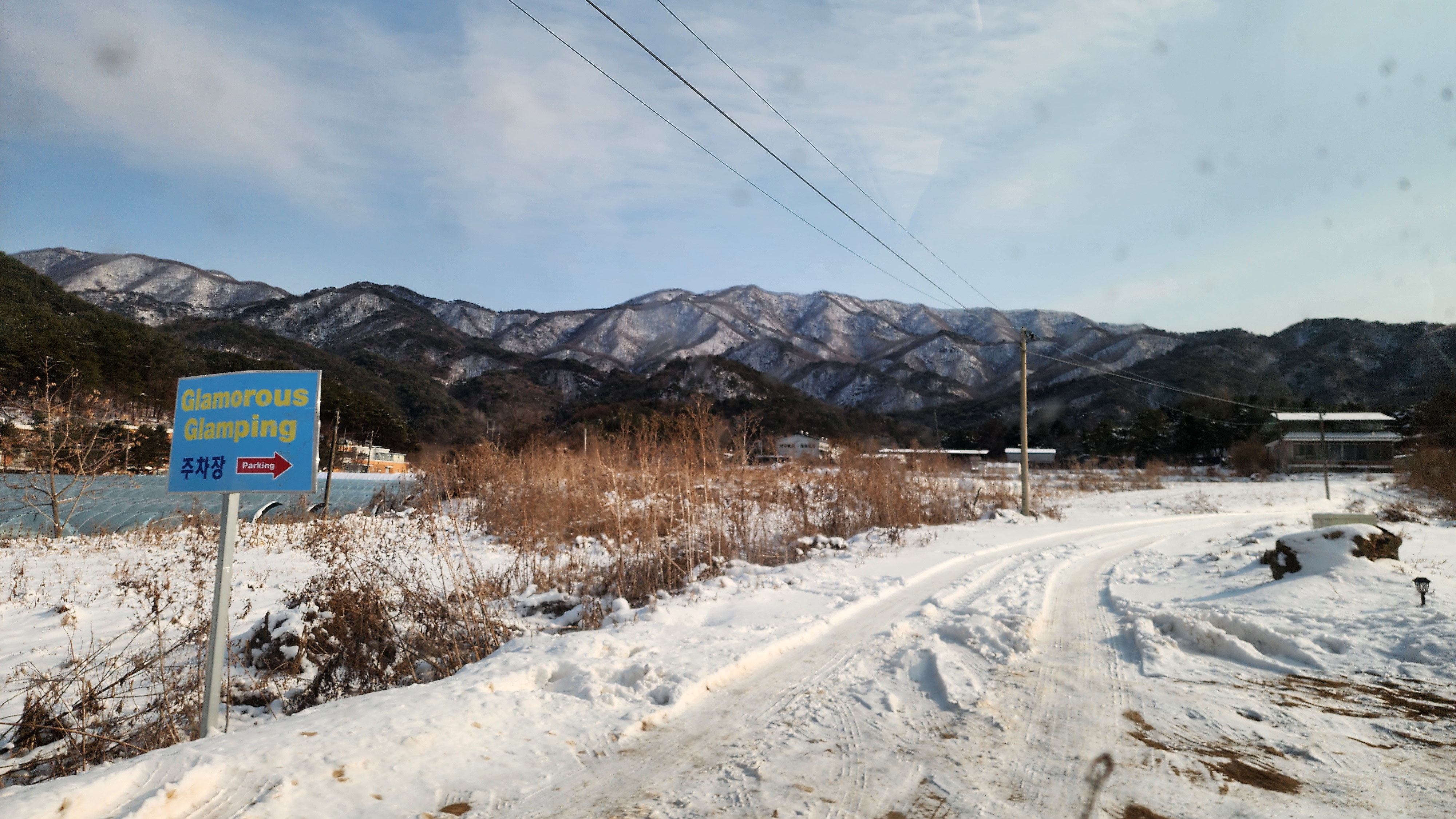 멋진 설산배경에 있는 주차장에 주차를 하고 글램핑장으로 고고!!