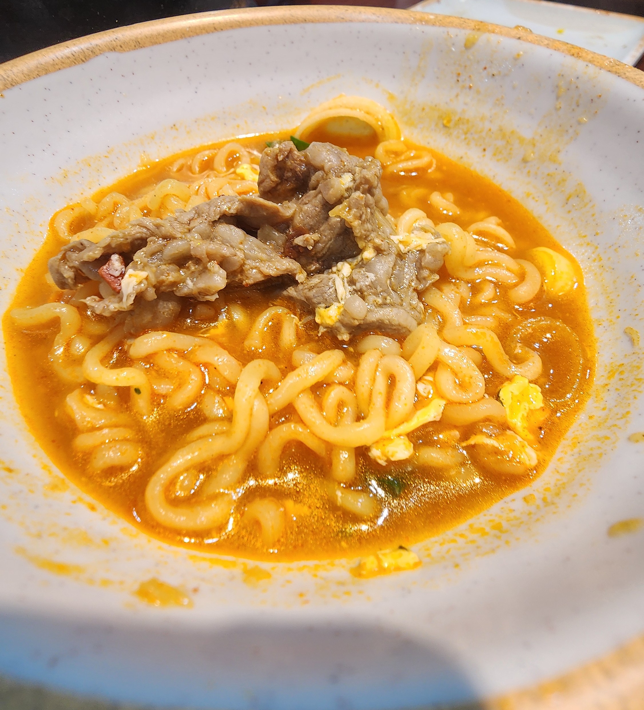 한우마늘라면에도 고기가 많아요. 마늘맛이 강한 한국인 맞춤라면입니다.