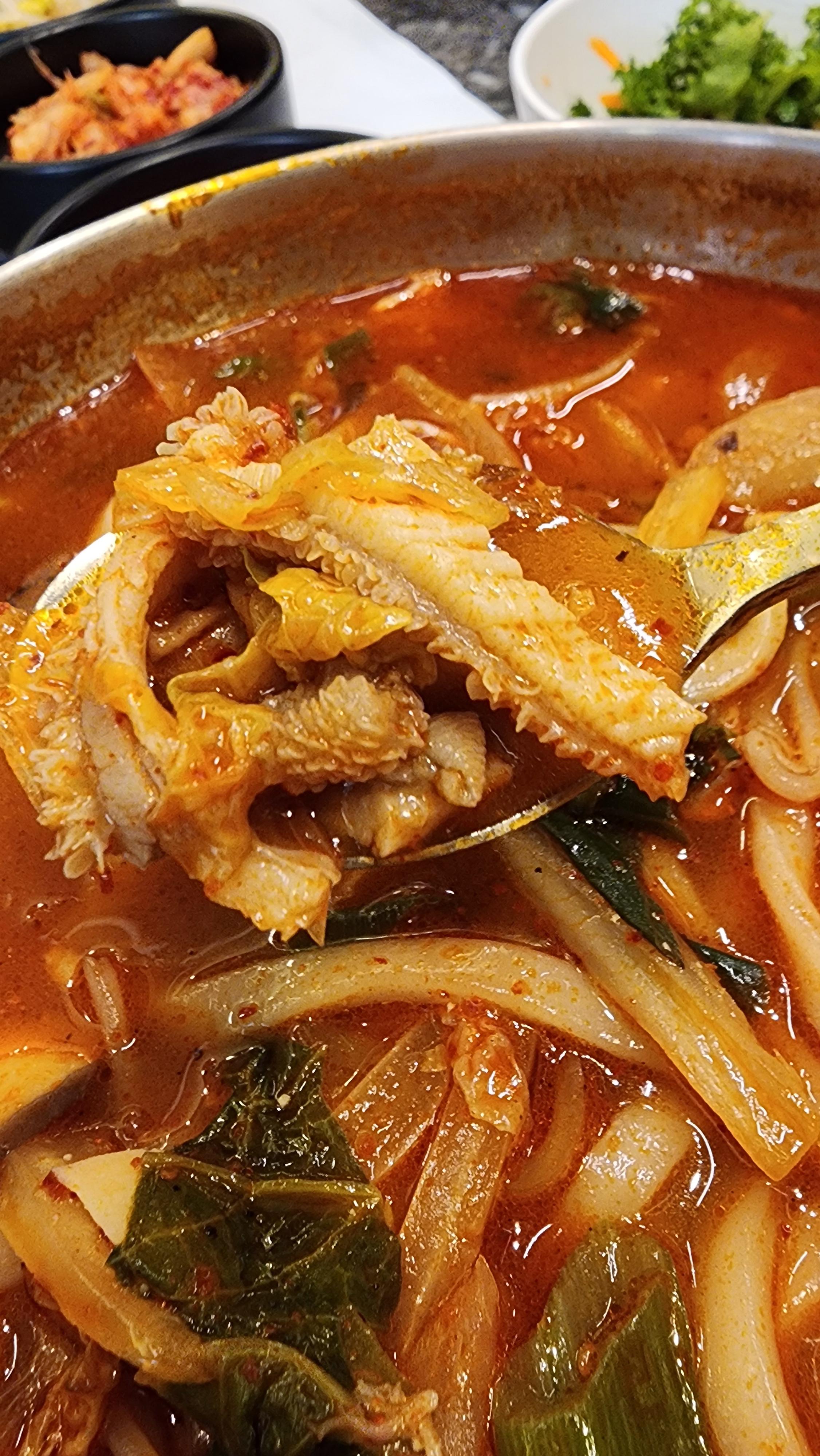 얼큰한 곱창국수. 곱창이 듬뿍들어있어요. 얼큰한 맛에 배가 불러도 계속 먹게 되는 맛입니다.