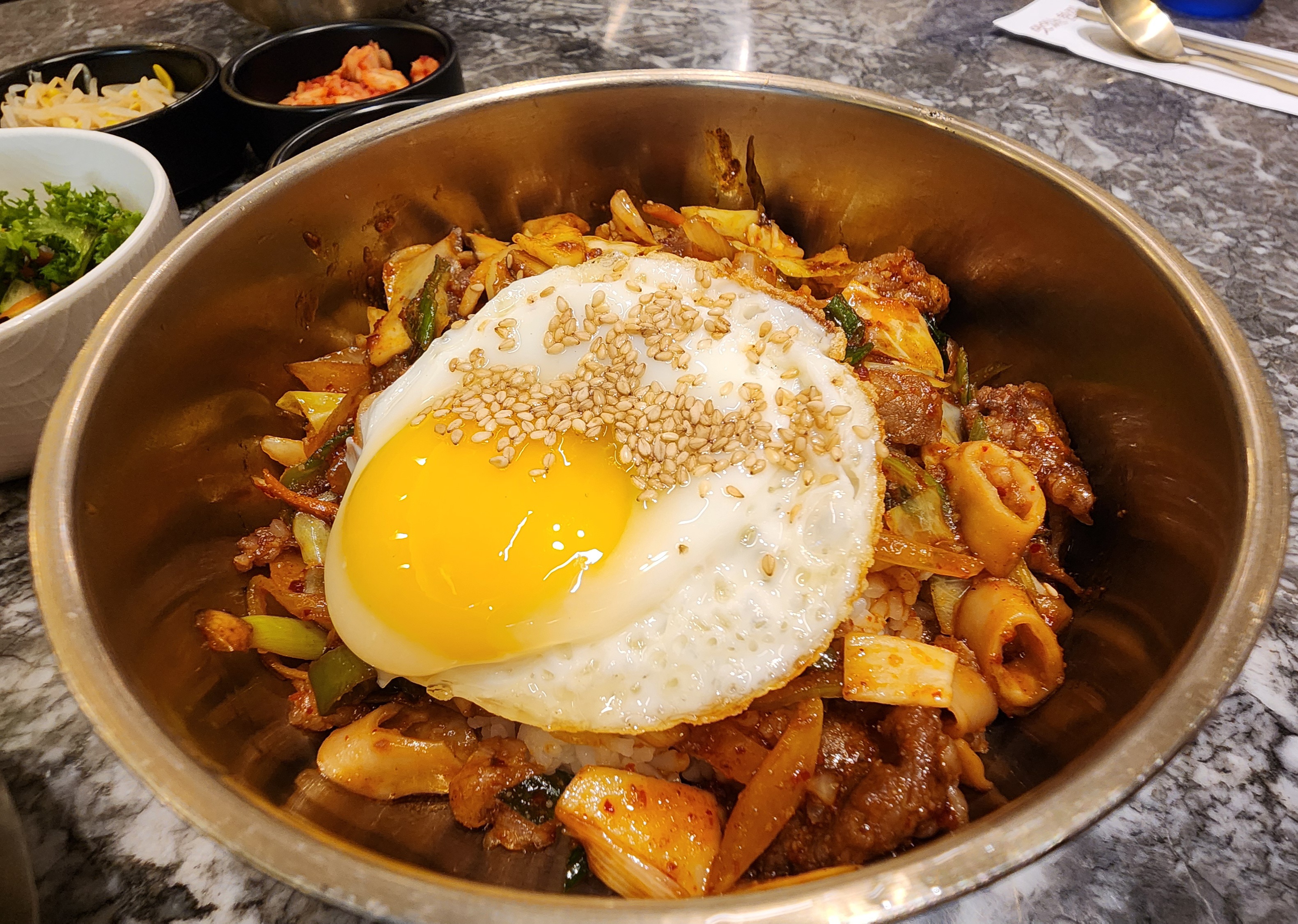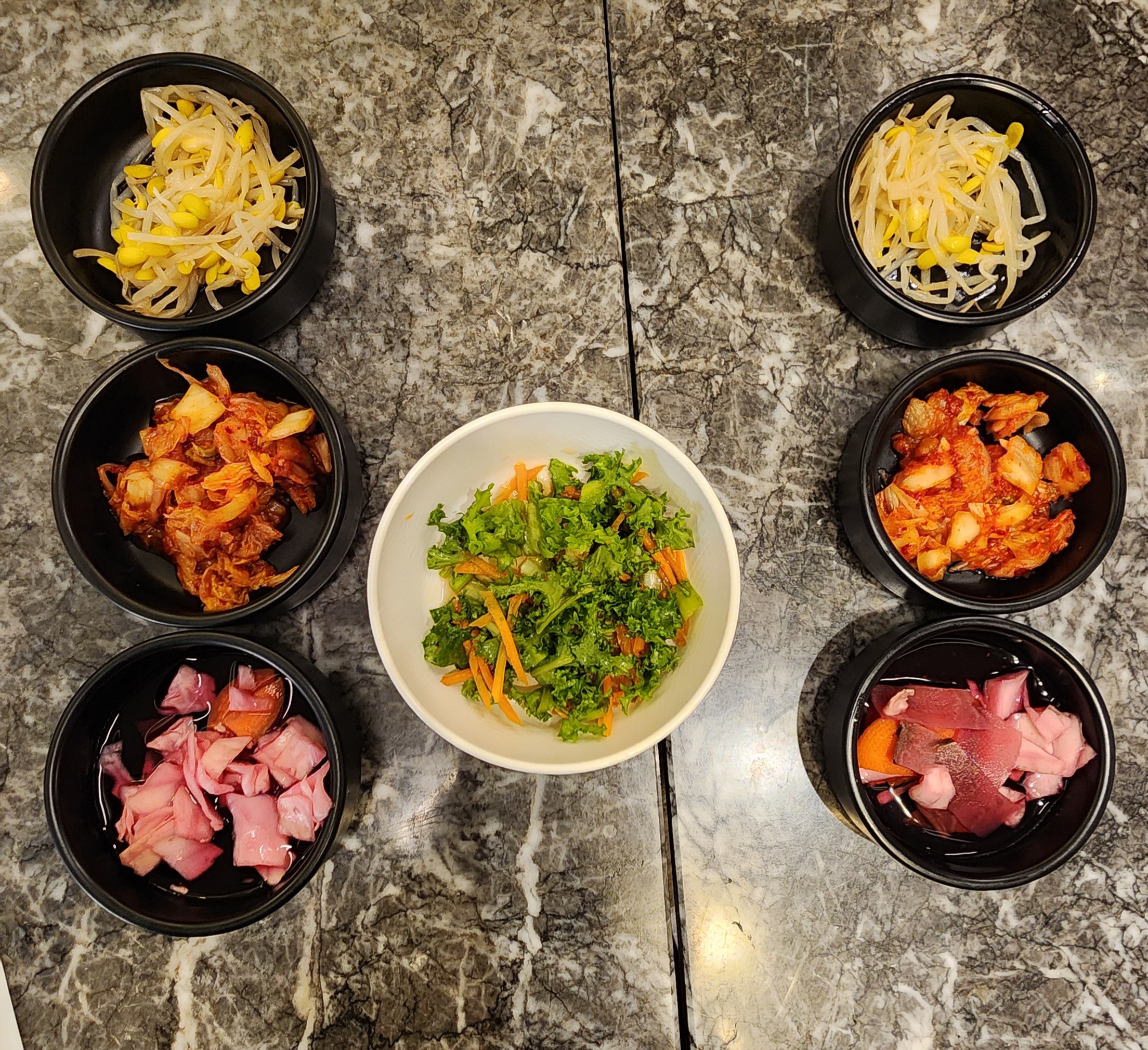 콩나물, 양배추 절임, 김치와 샐러드 기본찬이 나오고 부족한 반찬은 셀프바에서 리필 가능합니다.
