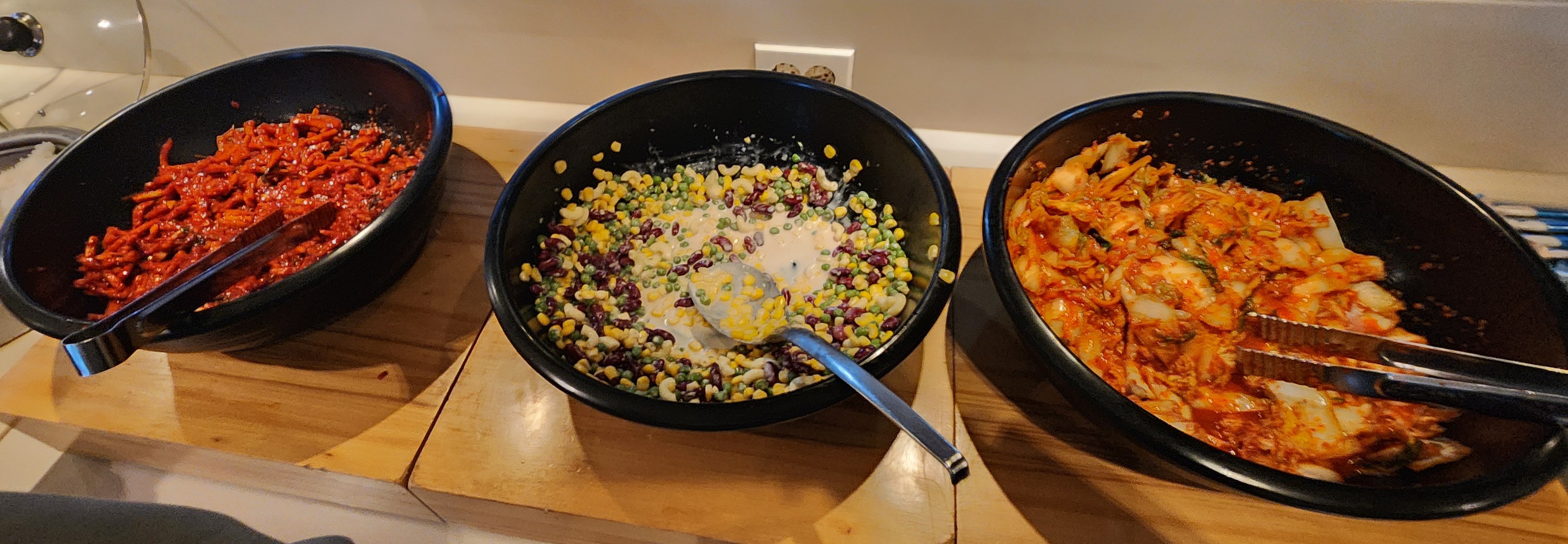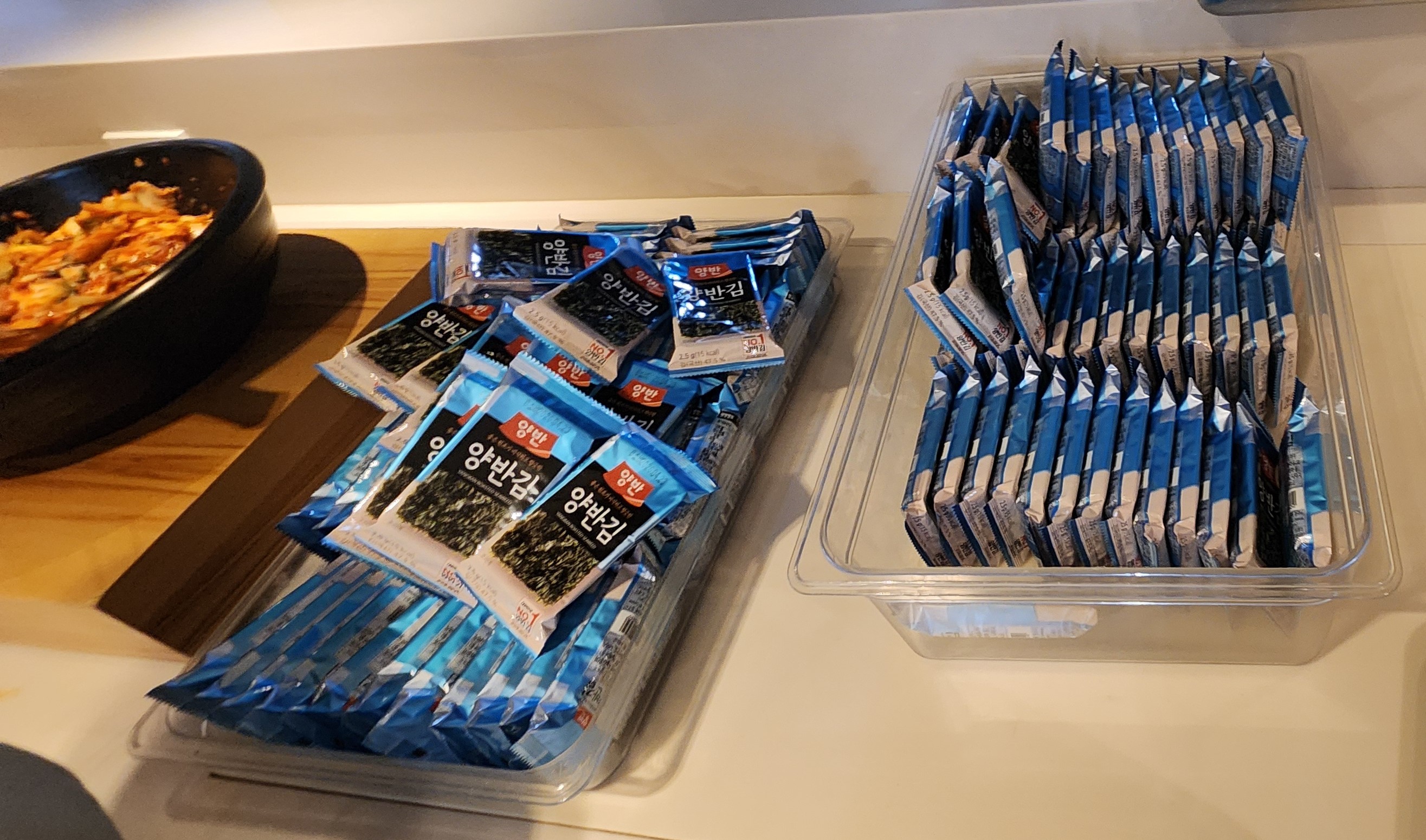 김, 김치와, 밥, 미역국, 스프, 계란찜과 소세지, 각종 샐러드, 빵, 씨리얼과 우유, 오렌지주스가 있어요.