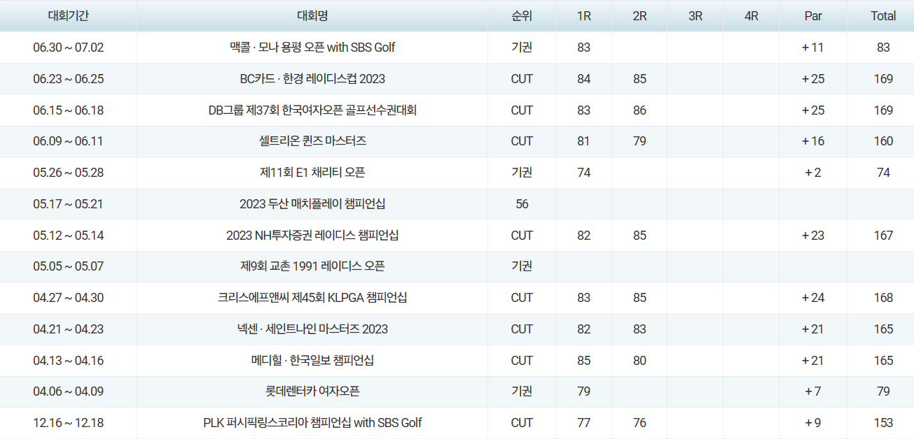 3위의 성적을 마지막으로 하위권,CUT 탈락, 기권 등 급작스럽게 성적이 하락하는