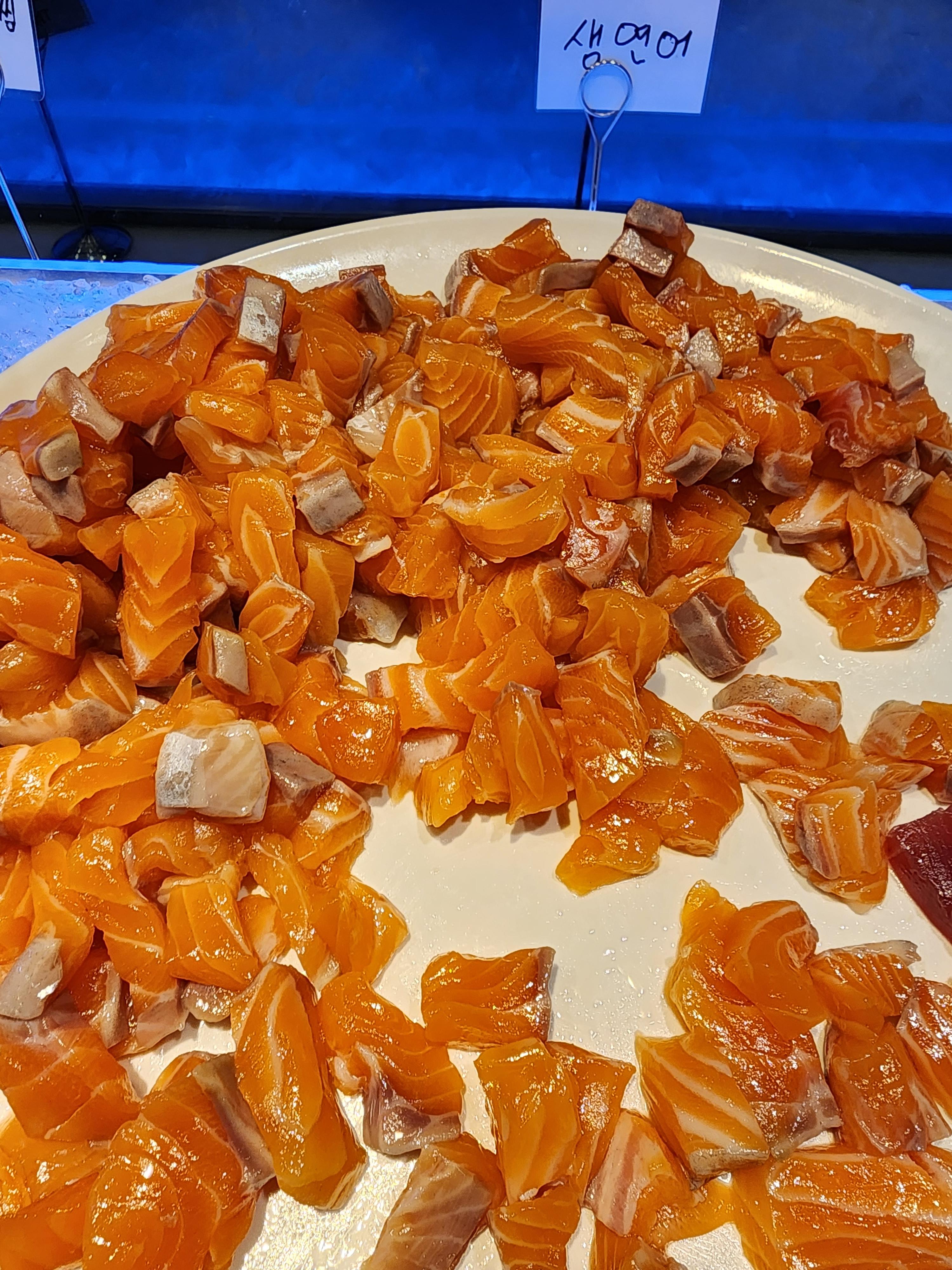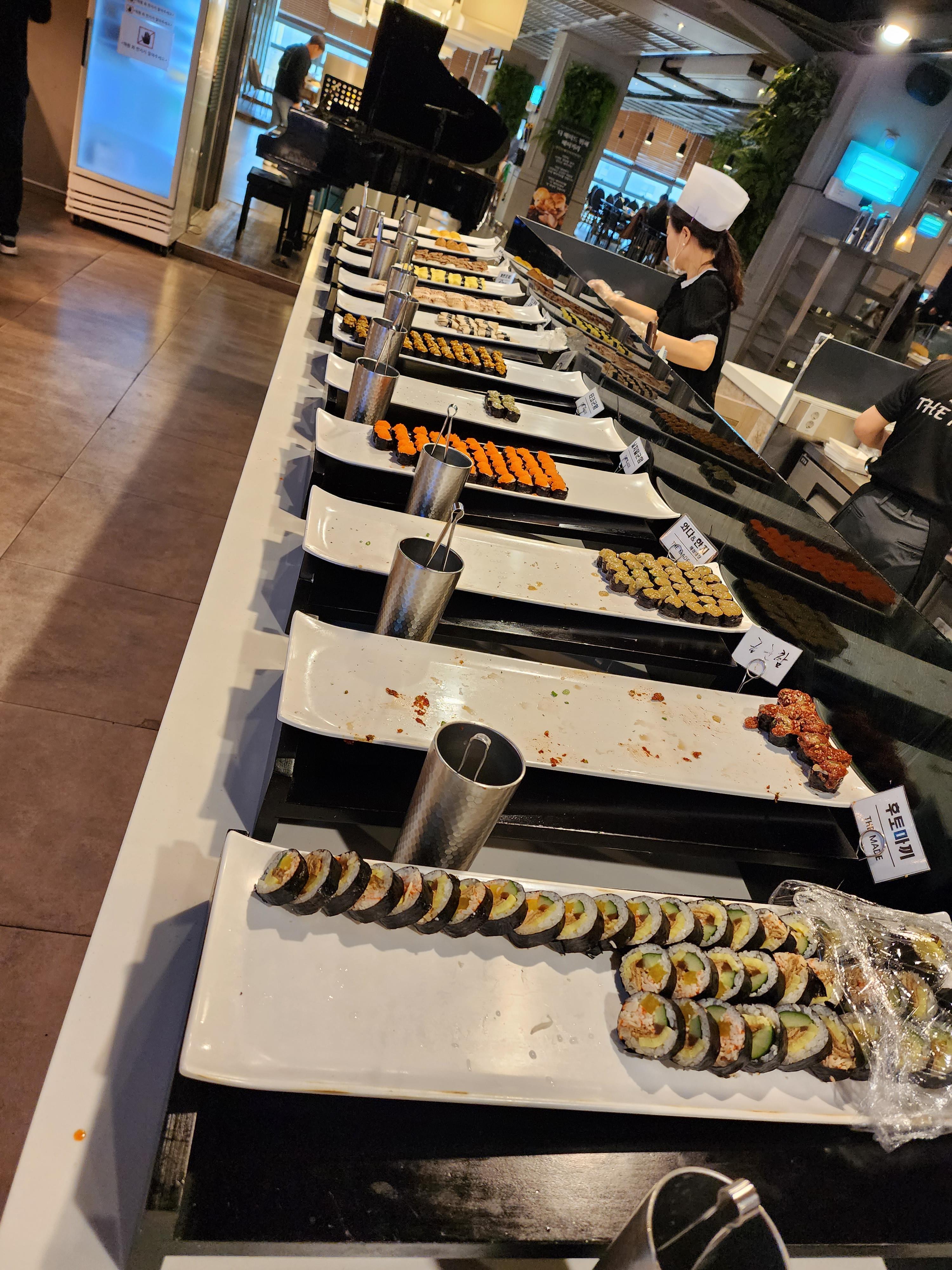 또 한가지 마음에 든 점은 음식 별로 나뉘어져 있다는것. 스시존, 한식존, 중식존, 따로 따로 떨어져 있어서 중식담으러 가고 싶은데 맨앞부터 줄서지 않아도 된다는 것이 너무 효율적이었어요.